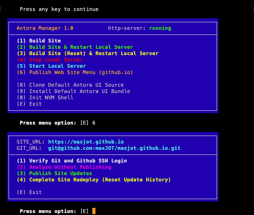 It transforms a single Antora site into a controlled, menu-driven deployment environment rather than relying on manual command sequencing.