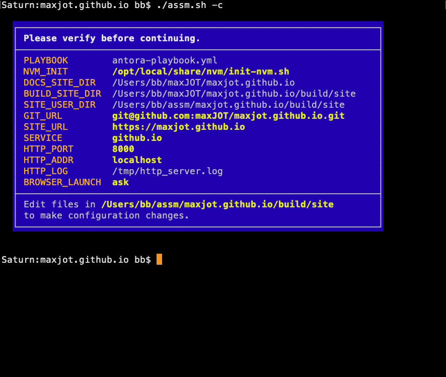 #==================================================================== # Filespec: /Users/dude/assm/maxjot.github.io/build/site/site.conf # Site Name: maxjot.github.io # Date: 05-Mar-26 #==================================================================== # # TCP port and TCP/IP address (hostname) of the http-server # providing the Antora Site on your local computer. # (usually this does not need to be changed.) HTTP_ADDR=localhost HTTP_PORT=8000 # After generating the Antora site, automatically open your # web browser to view the site served by the local http-server. # Set this to 'yes' or 'no', or 'ask'. BROWSER_LAUNCH=ask # Service to use when publishing the Antora generated site. # Currently only 'github.io' has been implemented. SERVICE=github.io # OS specific script to initialize the node shell environment. NVM_INIT="/opt/local/share/nvm/init-nvm.sh"