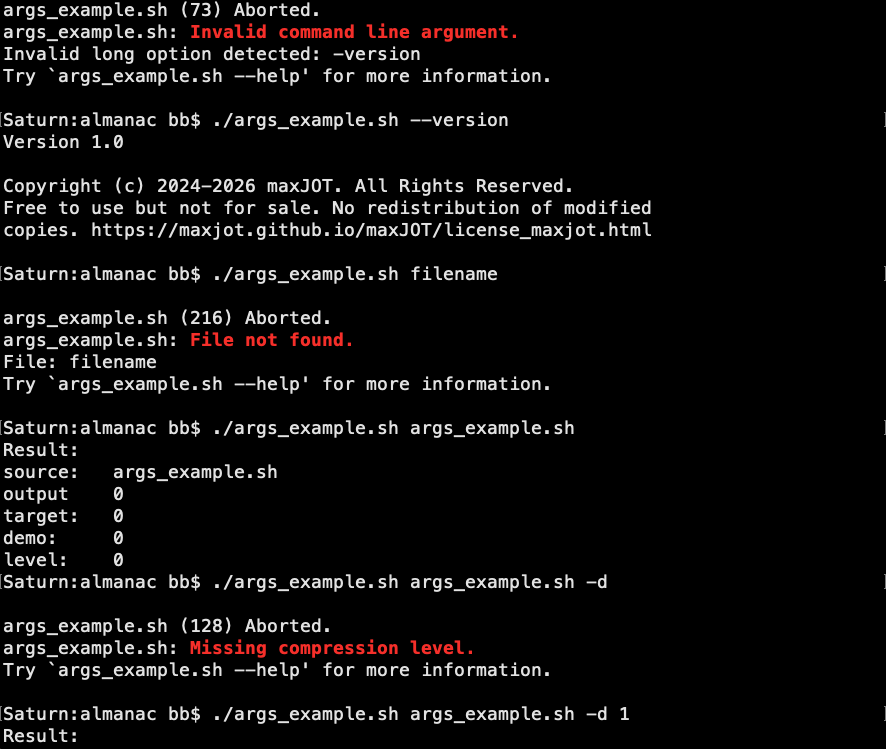 The Bash Almanac is a reference for building practical GNU Bash shell scripts. It provides reusable functions and examples for creating robust command-line tools and interactive CLI programs. All examples are tested under Linux and macOS. The snippets are self-contained and can be copied directly into your own scripts.