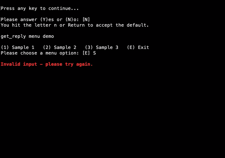 The get_reply function provides single-key user input with optional validation and default handling. When a list of valid options is supplied, the first item is automatically treated as the default and chosen if the user presses Return.